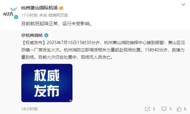 7月16日下午,杭州萧山国际机场发布情况通报:2025年7月16日15时30分许,杭州机场南跑道围界外约1.5公里处发生火情。目前航班起降正常,运行未受影响。