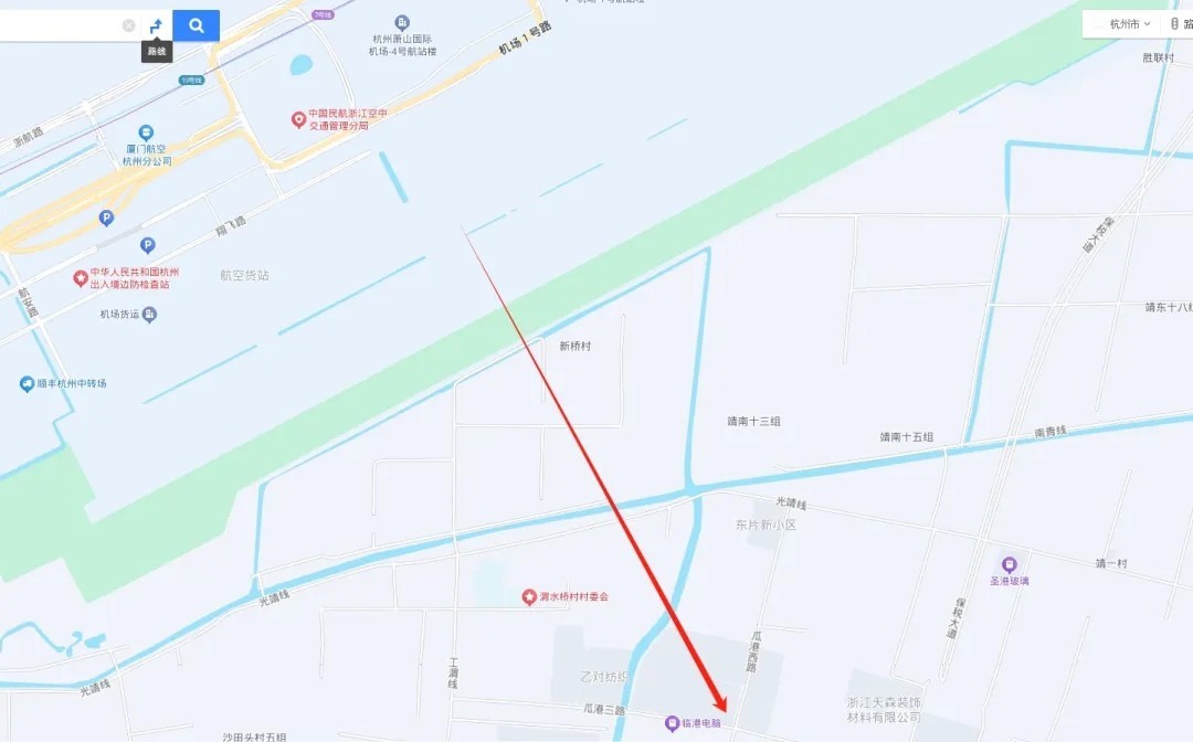 起火点距离杭州萧山国际机场的直线距离不足两公里(央广网发 记者截图自百度地图)